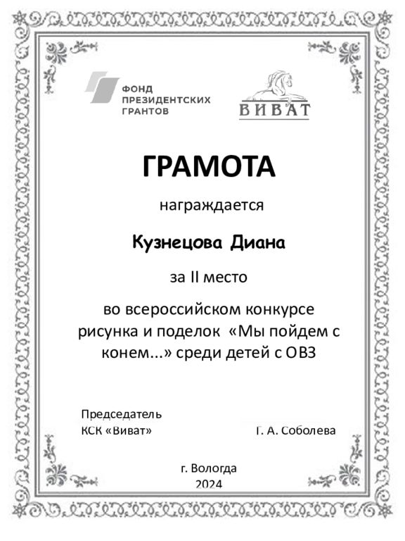 ГРАМОТА награждается Кузнецова Диана за II место во всероссийском конкурсе рисунка и поделок «Мы пойдем с конем...» среди детей с ОВЗ Председатель КСК «Виват» Г. А. Соболева г. Вологда 2024