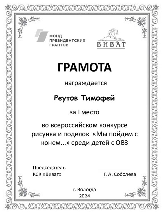 ГРАМОТА награждается Реутов Тимофей за I место во всероссийском конкурсе рисунка и поделок «Мы пойдем с конем...» среди детей с ОВЗ Председатель КСК «Виват» Г. А. Соболева г. Вологда 2024