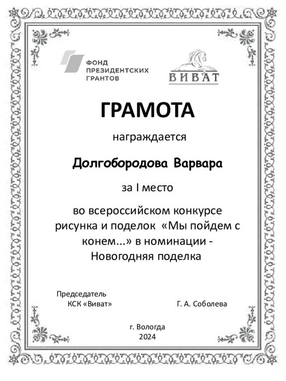 ГРАМОТА награждается Долгобородова Варвара за I место во всероссийском конкурсе рисунка и поделок «Мы пойдем с конем...» в номинации - Новогодняя поделка Председатель КСК «Виват» Г. А. Соболева г. Вологда 2024