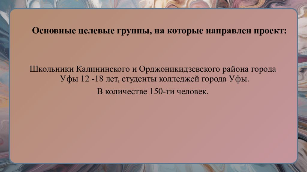 Школьники Калининского и Орджоникидзевского района города Уфы 12 -18 лет, студенты колледжей города Уфы. В количестве 150-ти человек.