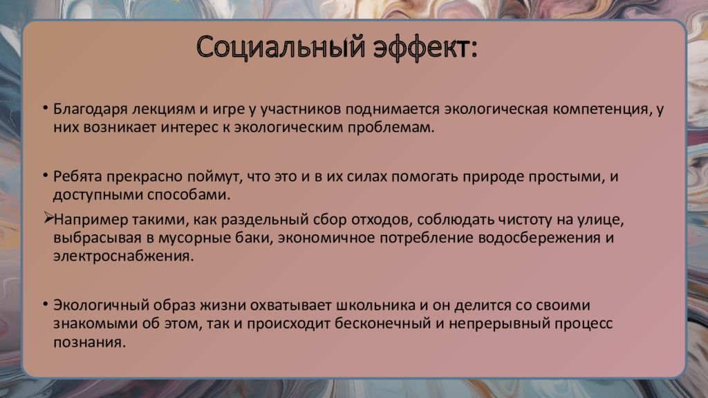 Благодаря лекциям и игре у участников поднимается экологическая компетенция, у них возникает интерес к экологическим проблемам. Ребята прекрасно поймут, что это и в их силах помогать природе простыми, и доступными способами. Например такими, как раздельный сбор отходов, соблюдать чистоту на улице, выбрасывая в мусорные баки, экономичное потребление водосбережения и электроснабжения. Экологичный образ жизни охватывает школьника и он делится со своими знакомыми об этом, так и происходит бесконечный и непрерывный процесс познания.