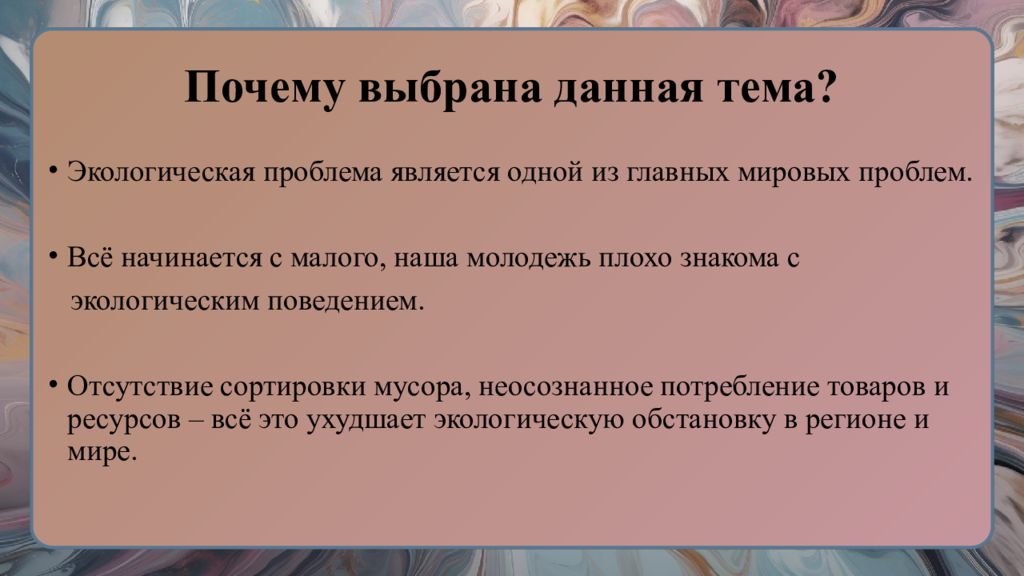 Экологическая проблема является одной из главных мировых проблем. Всё начинается с малого, наша молодежь плохо знакома с экологическим поведением. Отсутствие сортировки мусора, неосознанное потребление товаров и ресурсов – всё это ухудшает экологическую обстановку в регионе и мире.