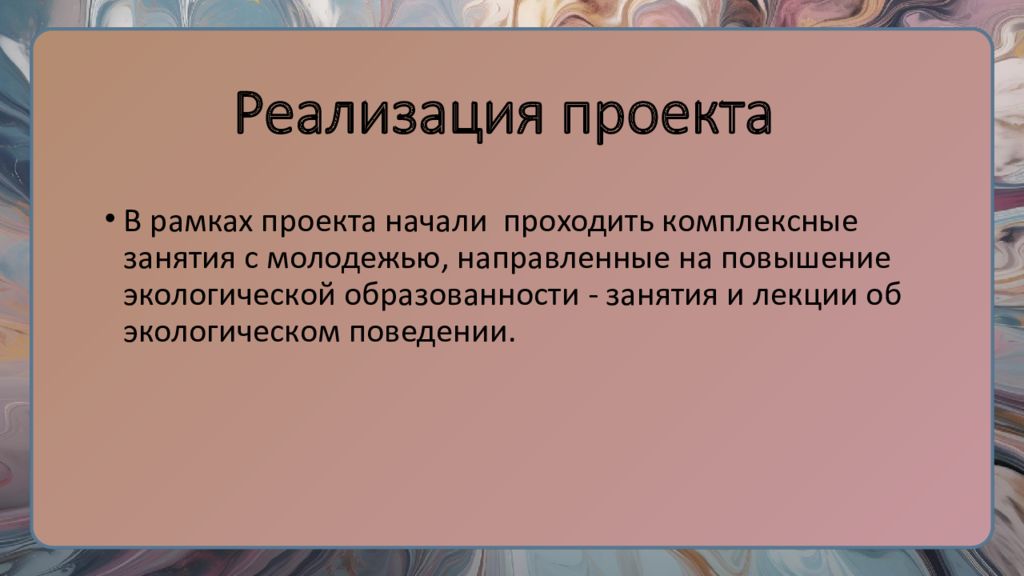 В рамках проекта начали проходить комплексные занятия с молодежью, направленные на повышение экологической образованности - занятия и лекции об экологическом поведении.