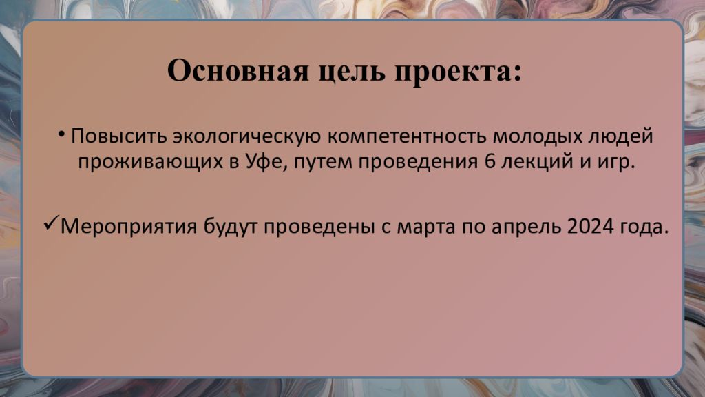 Повысить экологическую компетентность молодых людей проживающих в Уфе, путем проведения 6 лекций и игр. Мероприятия будут проведены с марта по апрель 2024 года.