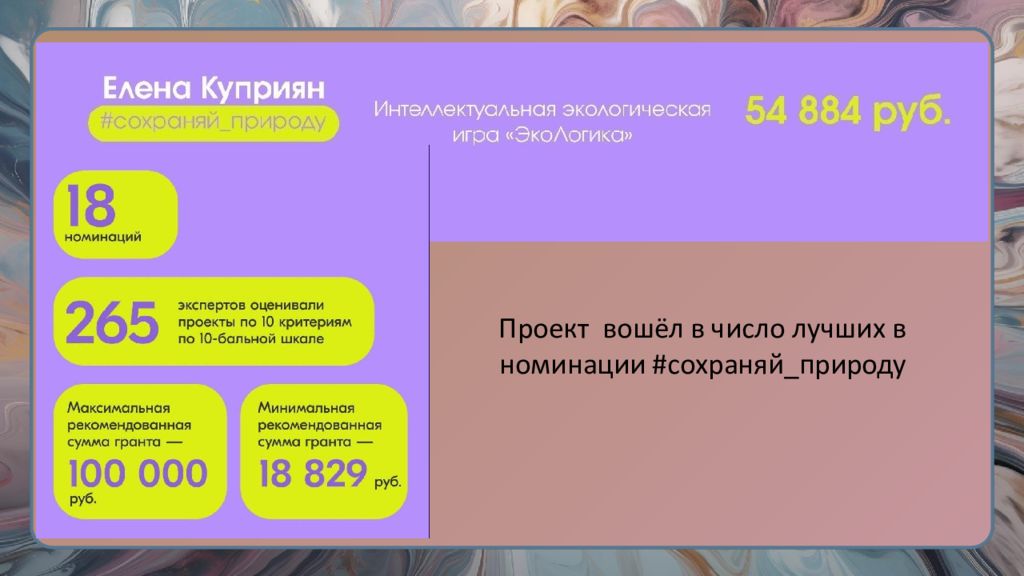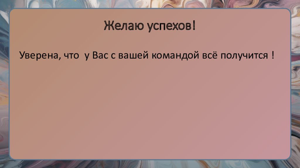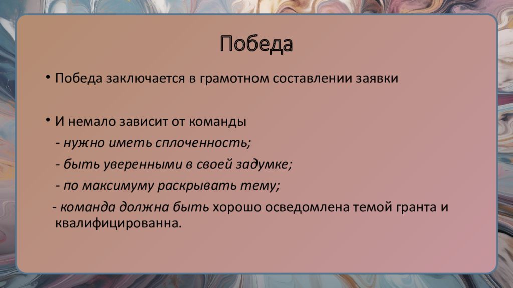 Победа заключается в грамотном составлении заявки И немало зависит от команды - нужно иметь сплоченность; - быть уверенными в своей задумке; - по максимуму раскрывать тему; - команда должна быть хорошо осведомлена темой гранта и квалифицированна.