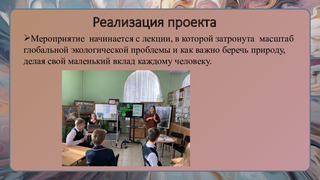 Мероприятие начинается с лекции, в которой затронута масштаб глобальной экологической проблемы и как важно беречь природу, делая свой маленький вклад каждому человеку.