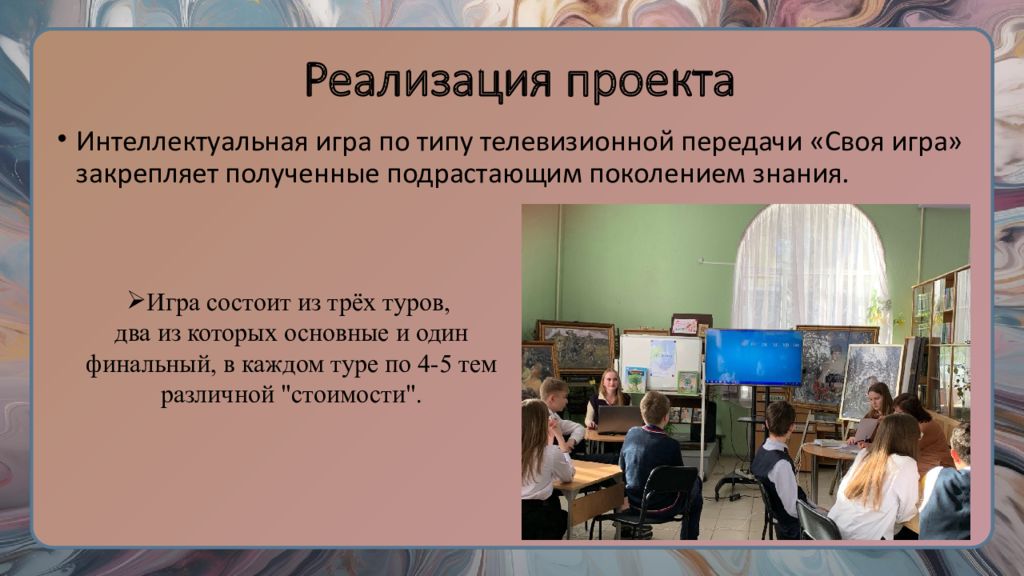 Интеллектуальная игра по типу телевизионной передачи «Своя игра» закрепляет полученные подрастающим поколением знания. Игра состоит из трёх туров, два из которых основные и один финальный, в каждом туре по 4-5 тем различной "стоимости".