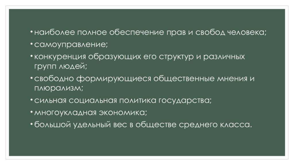 наиболее полное обеспечение прав и свобод человека; самоуправление; конкуренция образующих его структур и различных групп людей; свободно формирующиеся общественные мнения и плюрализм; сильная социальная политика государства; многоукладная экономика; большой удельный вес в обществе среднего класса.