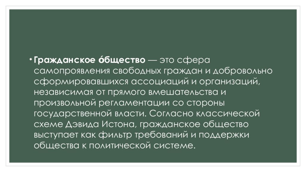 Гражданское о́бщество — это сфера самопроявления свободных граждан и добровольно сформировавшихся ассоциаций и организаций, независимая от прямого вмешательства и произвольной регламентации со стороны государственной власти. Согласно классической схеме Дэвида Истона, гражданское общество выступает как фильтр требований и поддержки общества к политической системе.