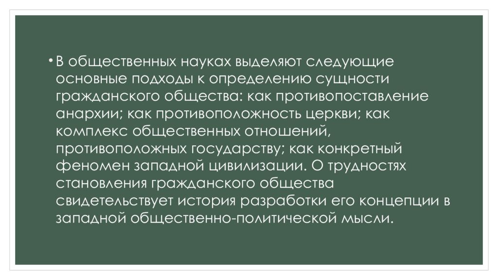 В общественных науках выделяют следующие основные подходы к определению сущности гражданского общества: как противопоставление анархии; как противоположность церкви; как комплекс общественных отношений, противоположных государству; как конкретный феномен западной цивилизации. О трудностях становления гражданского общества свидетельствует история разработки его концепции в западной общественно-политической мысли.