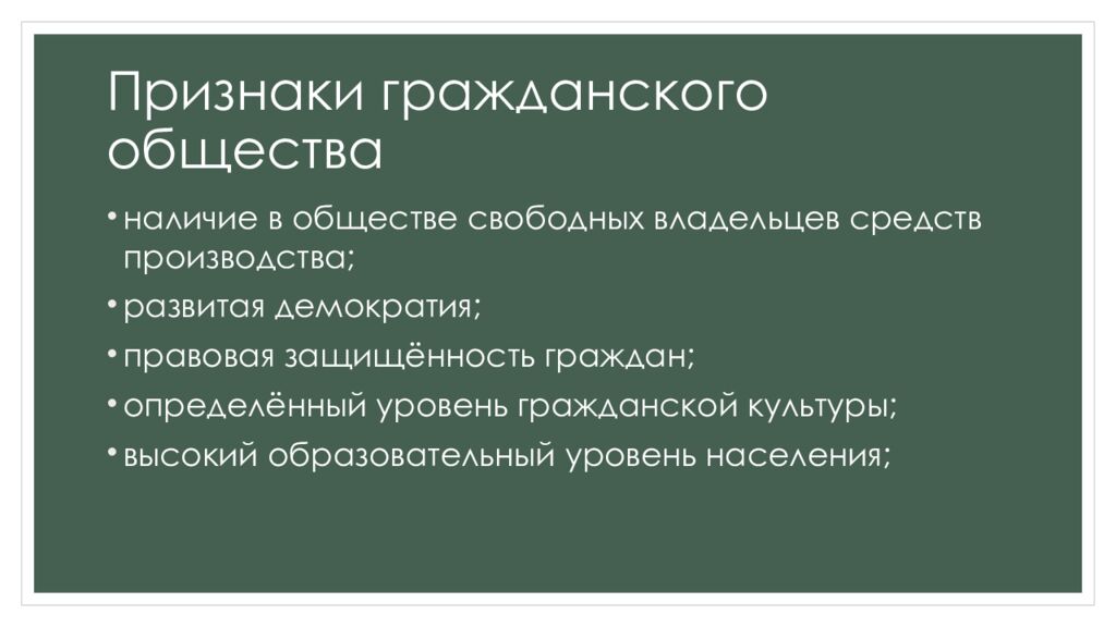 наличие в обществе свободных владельцев средств производства; развитая демократия; правовая защищённость граждан; определённый уровень гражданской культуры; высокий образовательный уровень населения;