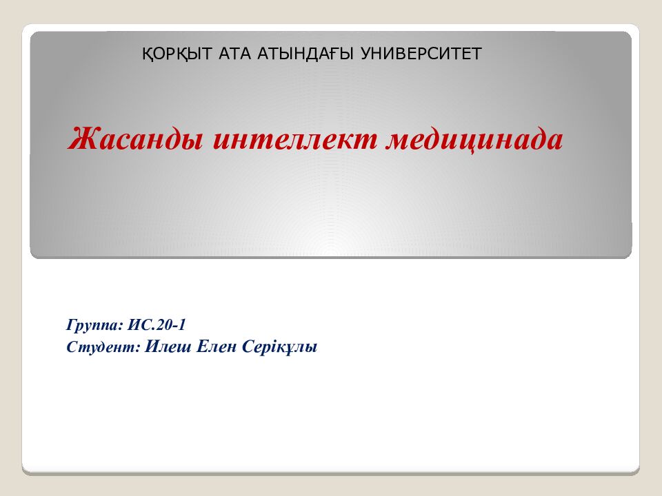 Группа: ИС.20-1 Студент: Илеш Елен Серікұлы Жасанды интеллект медицинада ҚОРҚЫТ АТА АТЫНДАҒЫ УНИВЕРСИТЕТ