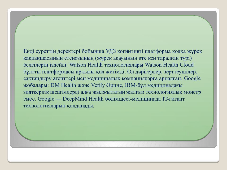 Енді суреттің деректері бойынша УДЗ когнитивті платформа қолқа жүрек қақпақшасының стенозының ( жүрек ақауының өте кең таралған түрі ) белгілерін іздейді. Watson Health технологиялары Watson Health Cloud бұлтты платформасы арқылы қол жетімді. Ол дәрігерлер, зерттеушілер, сақтандыру агенттері мен медициналық компанияларға арналған. Google жобалары : DM Health және Verily Әрине, IBM- бұл медицинадағы зияткерлік шешімдерді алға жылжытатын жалғыз технологиялық монстр емес. Google — DeepMind Health бөлімшесі-медицинада IT- гигант технологияларын қолданады.