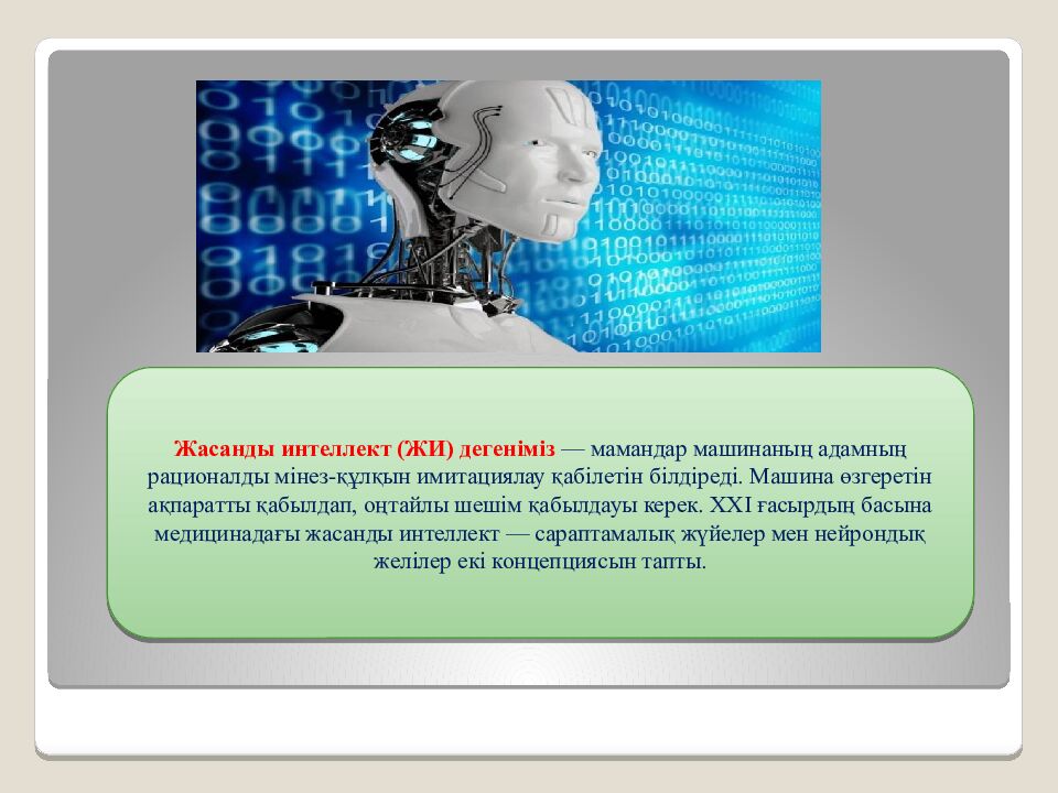 Жасанды интеллект (ЖИ) дегеніміз — мамандар машинаның адамның рационалды мінез-құлқын имитациялау қабілетін білдіреді. Машина өзгеретін ақпаратты қабылдап, оңтайлы шешім қабылдауы керек. ХХІ ғасырдың басына медицинадағы жасанды интеллект — сараптамалық жүйелер мен нейрондық желілер екі концепциясын тапты.