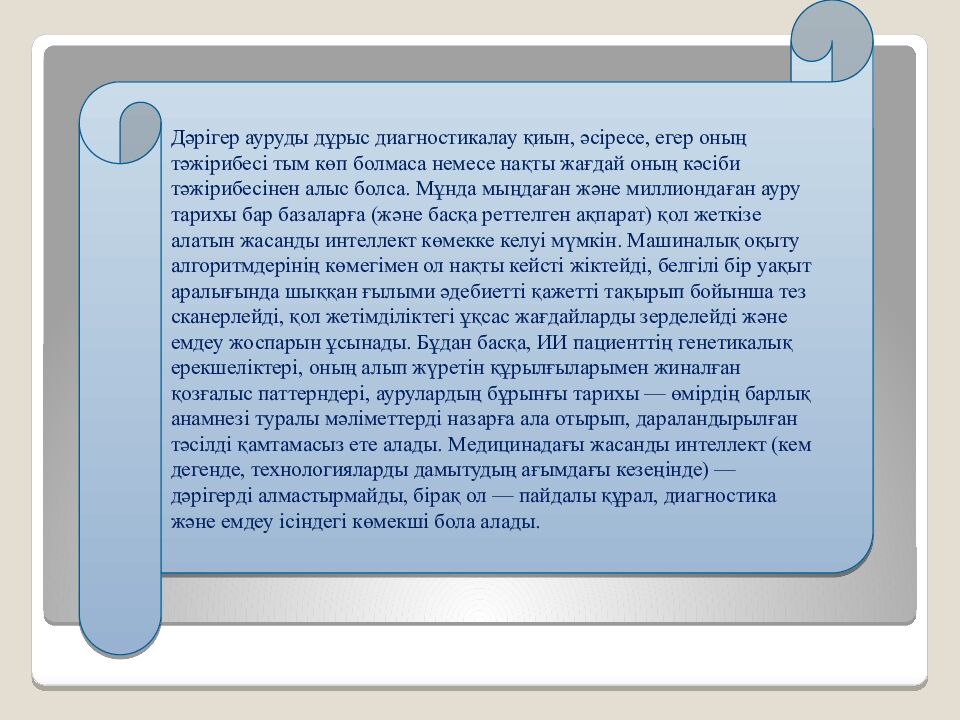 Дәрігер ауруды дұрыс диагностикалау қиын, әсіресе, егер оның тәжірибесі тым көп болмаса немесе нақты жағдай оның кәсіби тәжірибесінен алыс болса. Мұнда мыңдаған және миллиондаған ауру тарихы бар базаларға ( және басқа реттелген ақпарат ) қол жеткізе алатын жасанды интеллект көмекке келуі мүмкін. Машиналық оқыту алгоритмдерінің көмегімен ол нақты кейсті жіктейді, белгілі бір уақыт аралығында шыққан ғылыми әдебиетті қажетті тақырып бойынша тез сканерлейді, қол жетімділіктегі ұқсас жағдайларды зерделейді және емдеу жоспарын ұсынады. Бұдан басқа, ИИ пациенттің генетикалық ерекшеліктері, оның алып жүретін құрылғыларымен жиналған қозғалыс паттерндері, аурулардың бұрынғы тарихы — өмірдің барлық анамнезі туралы мәліметтерді назарға ала отырып, дараландырылған тәсілді қамтамасыз ете алады. Медицинадағы жасанды интеллект (кем дегенде, технологияларды дамытудың ағымдағы кезеңінде ) — дәрігерді алмастырмайды, бірақ ол — пайдалы құрал, диагностика және емдеу ісіндегі көмекші бола алады.