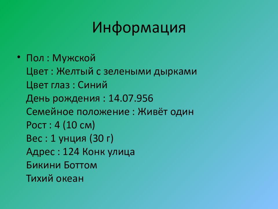 Пол : Мужской Цвет : Желтый с зелеными дырками Цвет глаз : Синий День рождения : 14.07.956 Семейное положение : Живёт один Рост : 4 (10 см) Вес : 1 унция (30 г) Адрес : 124 Конк улица Бикини Боттом Тихий океан
