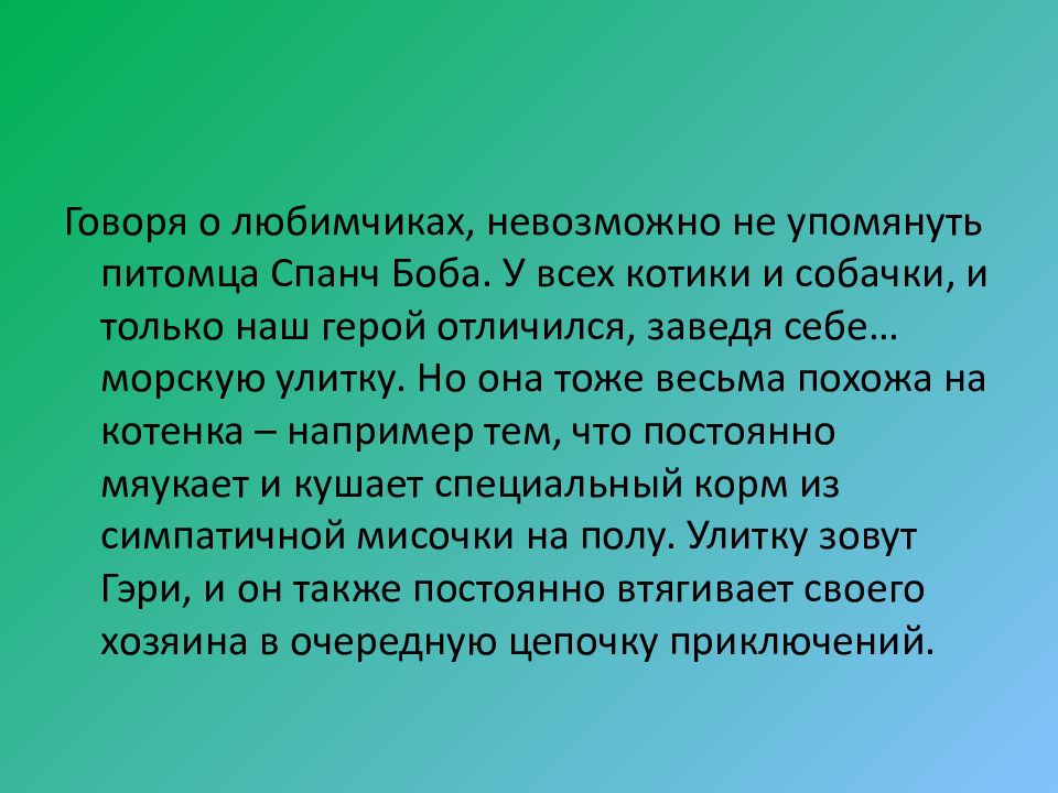 Говоря о любимчиках, невозможно не упомянуть питомца Спанч Боба. У всех котики и собачки, и только наш герой отличился, заведя себе… морскую улитку. Но она тоже весьма похожа на котенка – например тем, что постоянно мяукает и кушает специальный корм из симпатичной мисочки на полу. Улитку зовут Гэри, и он также постоянно втягивает своего хозяина в очередную цепочку приключений.