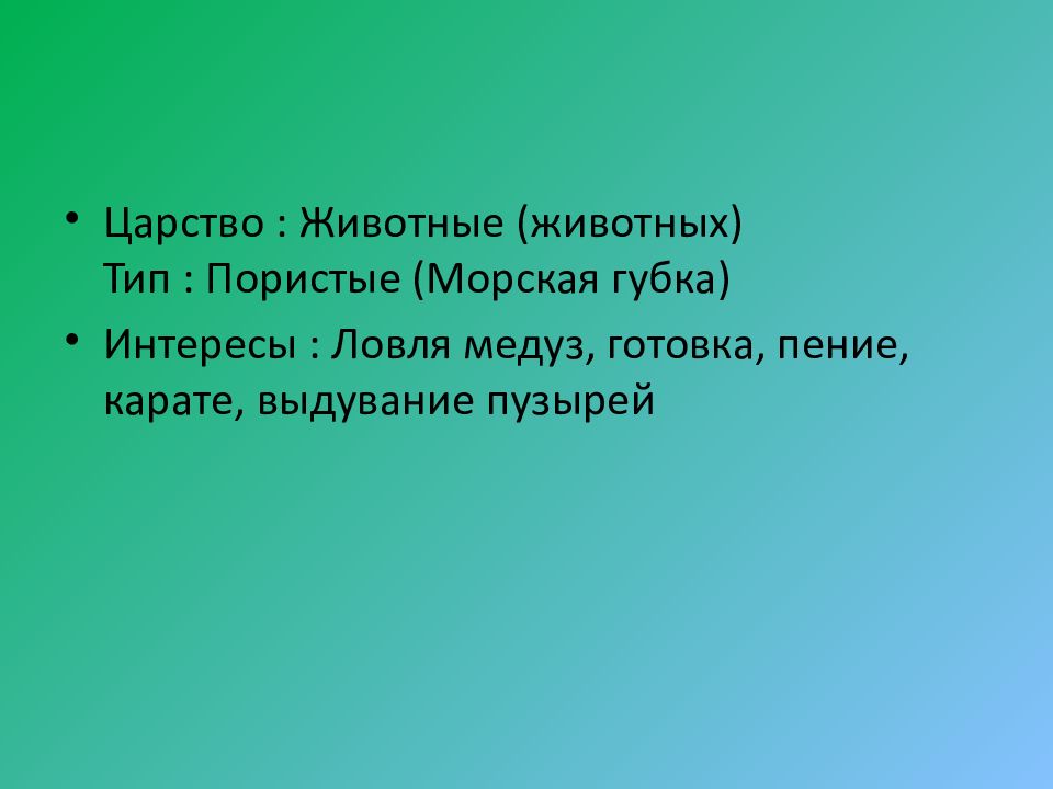 Царство : Животные (животных) Тип : Пористые (Морская губка) Интересы : Ловля медуз, готовка, пение, карате, выдувание пузырей