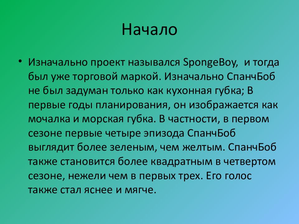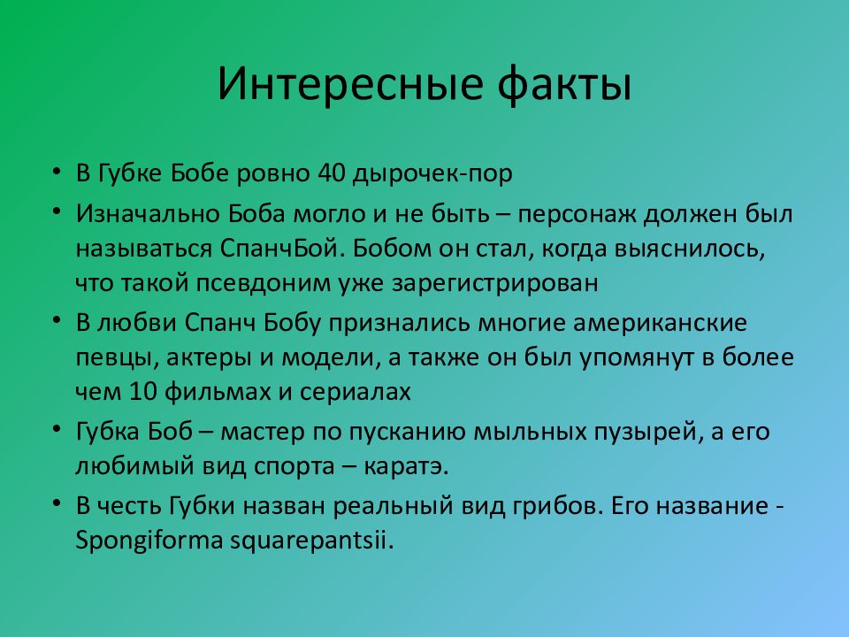 В Губке Бобе ровно 40 дырочек-пор Изначально Боба могло и не быть – персонаж должен был называться СпанчБой. Бобом он стал, когда выяснилось, что такой псевдоним уже зарегистрирован В любви Спанч Бобу признались многие американские певцы, актеры и модели, а также он был упомянут в более чем 10 фильмах и сериалах Губка Боб – мастер по пусканию мыльных пузырей, а его любимый вид спорта – каратэ. В честь Губки назван реальный вид грибов. Его название - Spongiforma squarepantsii.