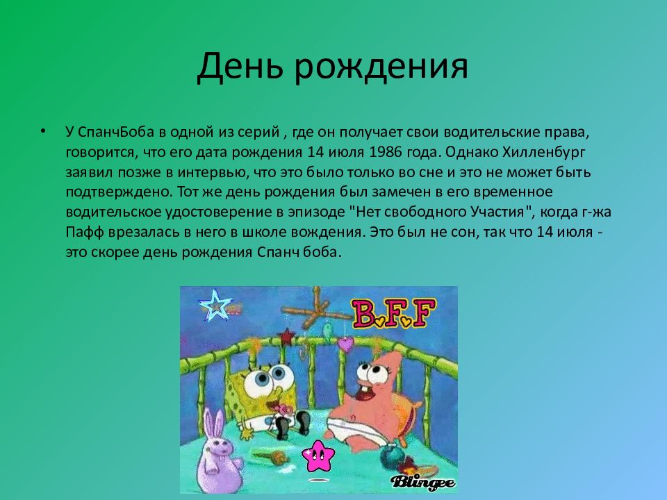 У СпанчБоба в одной из серий, где он получает свои водительские права, говорится, что его дата рождения 14 июля 1986 года. Однако Хилленбург заявил позже в интервью, что это было только во сне и это не может быть подтверждено. Тот же день рождения был замечен в его временное водительское удостоверение в эпизоде "Нет свободного Участия", когда г-жа Пафф врезалась в него в школе вождения. Это был не сон, так что 14 июля - это скорее день рождения Спанч боба.