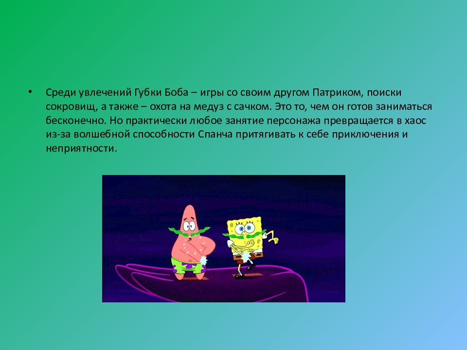 Среди увлечений Губки Боба – игры со своим другом Патриком, поиски сокровищ, а также – охота на медуз с сачком. Это то, чем он готов заниматься бесконечно. Но практически любое занятие персонажа превращается в хаос из-за волшебной способности Спанча притягивать к себе приключения и неприятности.