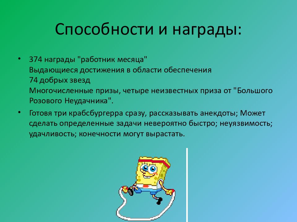 374 награды "работник месяца" Выдающиеся достижения в области обеспечения 74 добрых звезд Многочисленные призы, четыре неизвестных приза от "Большого Розового Неудачника". Готовя три крабсбургерра сразу, рассказывать анекдоты; Может сделать определенные задачи невероятно быстро; неуязвимость; удачливость; конечности могут вырастать.