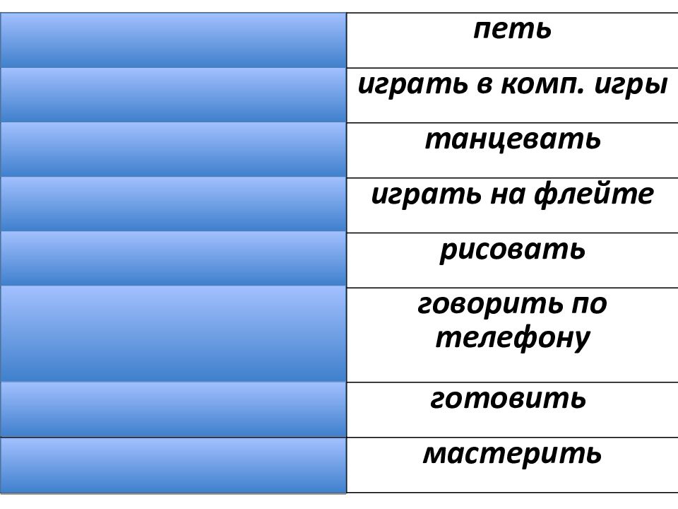 1. петь 2. играть в компьютерные игры 3. танцевать 4. играть на флейте 5. рисовать 6. говорить по телефону 7. готовить 8. мастерить Diktat