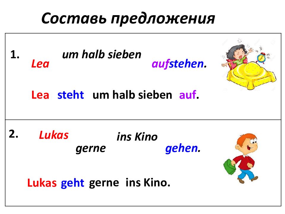Lea um halb sieben auf stehen. 1. Lea steht um halb sieben auf. 2. Lukas gerne ins Kino gehen. Lukas geht gerne ins Kino.