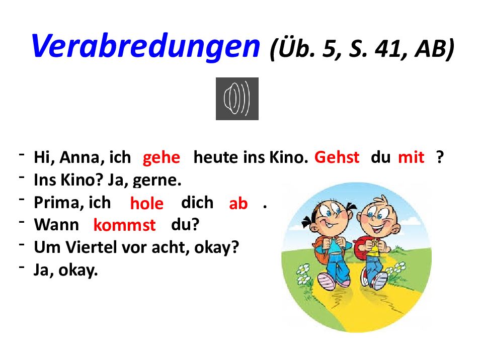 Verabredungen (Üb. 5, S. 41, AB) Hi, Anna, ich... heute ins Kino.... du... ? Ins Kino? Ja, gerne. Prima, ich... dich.... Wann... du? Um Viertel vor acht, okay? Ja, okay. Gehst gehe mit hole ab kommst