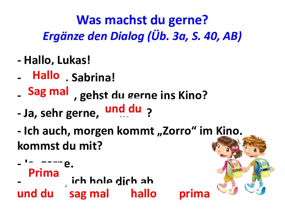 - Hallo, Lukas! -..., Sabrina! -..., gehst du gerne ins Kino? - Ja, sehr gerne,... ? - Ich auch, morgen kommt „Zorro“ im Kino, kommst du mit? - Ja, gerne. -..., ich hole dich ab. und du sag mal hallo prima Hallo Sag mal und du Prima