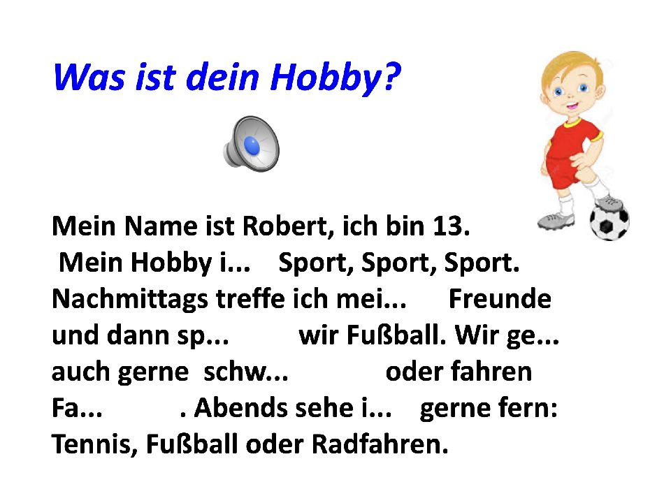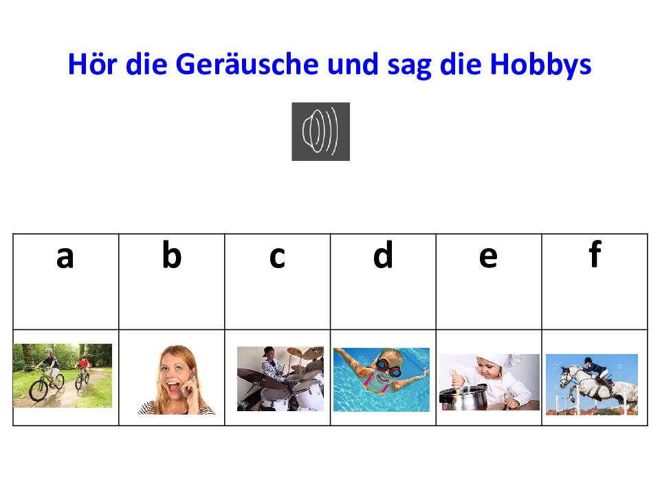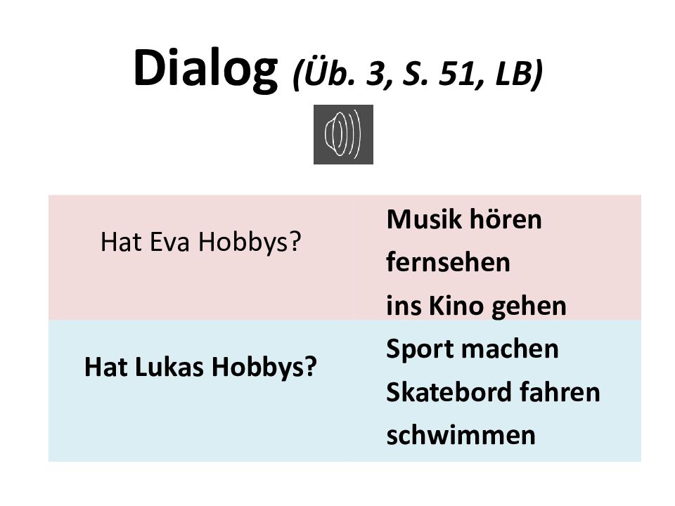 Hat Eva Hobbys? Hat Lukas Hobbys ? Musik hören fernsehen ins Kino gehen Sport machen Skatebord fahren schwimmen