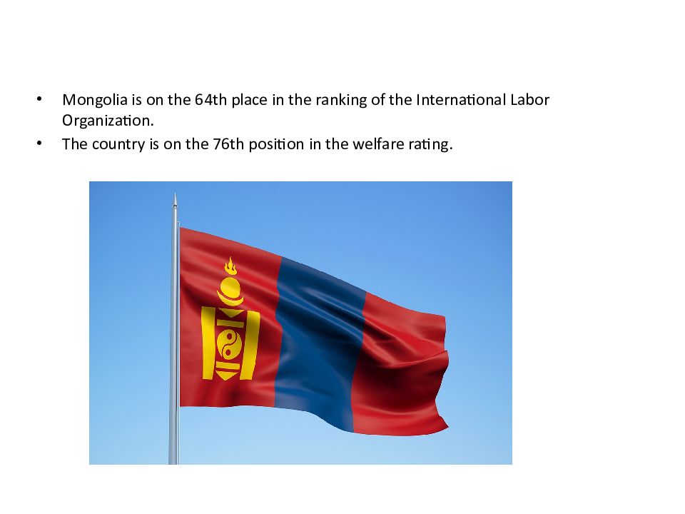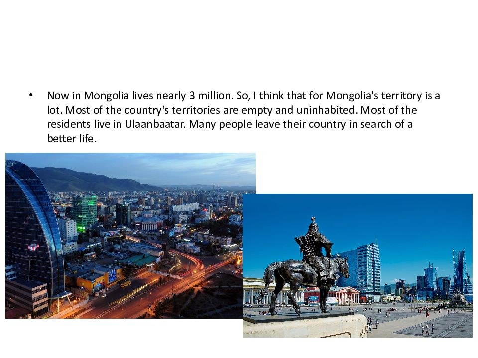 Now in Mongolia lives nearly 3 million. So, I think that for Mongolia's territory is a lot. Most of the country's territories are empty and uninhabited. Most of the residents live in Ulaanbaatar. Many people leave their country in search of a better life.