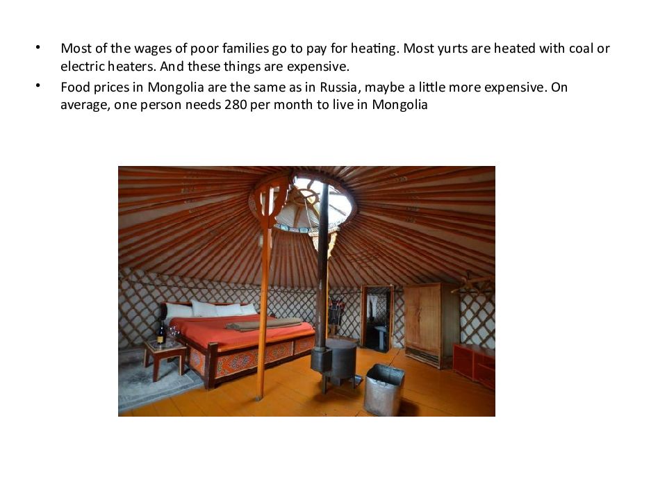 Most of the wages of poor families go to pay for heating. Most yurts are heated with coal or electric heaters. And these things are expensive. Food prices in Mongolia are the same as in Russia, maybe a little more expensive. On average, one person needs 280 per month to live in Mongolia
