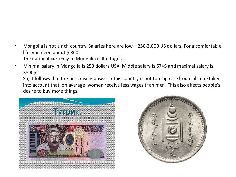 Mongolia is not a rich country. Salaries here are low – 250-3,000 US dollars. For a comfortable life, you need about $ 800. The national currency of Mongolia is the tugrik. Minimal salary in Mongolia is 250 dollars USA. Middle salary is 574$ and maximal salary is 3800$ So, it follows that the purchasing power in this country is not too high. It should also be taken into account that, on average, women receive less wages than men. This also affects people's desire to buy more things.