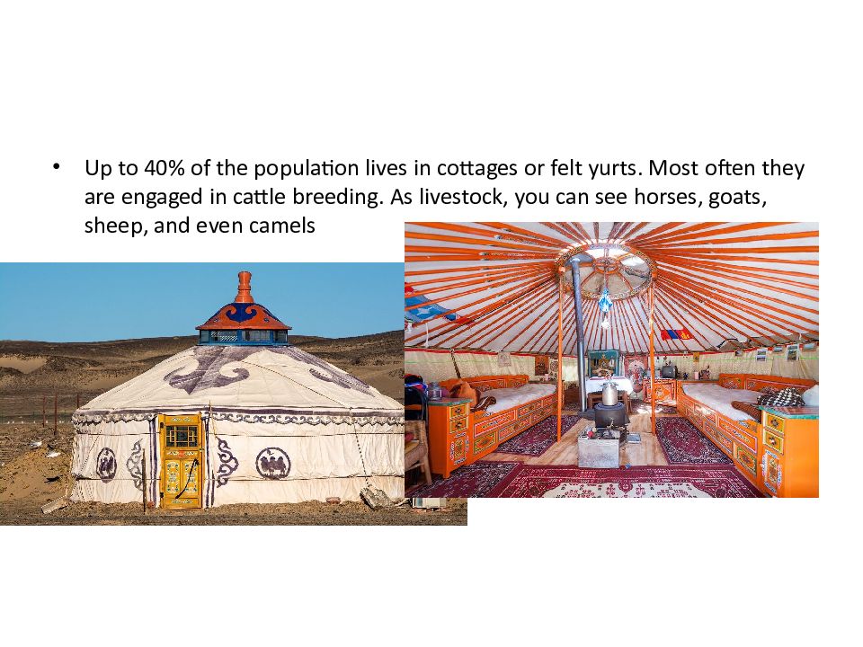 Up to 40% of the population lives in cottages or felt yurts. Most often they are engaged in cattle breeding. As livestock, you can see horses, goats, sheep, and even camels