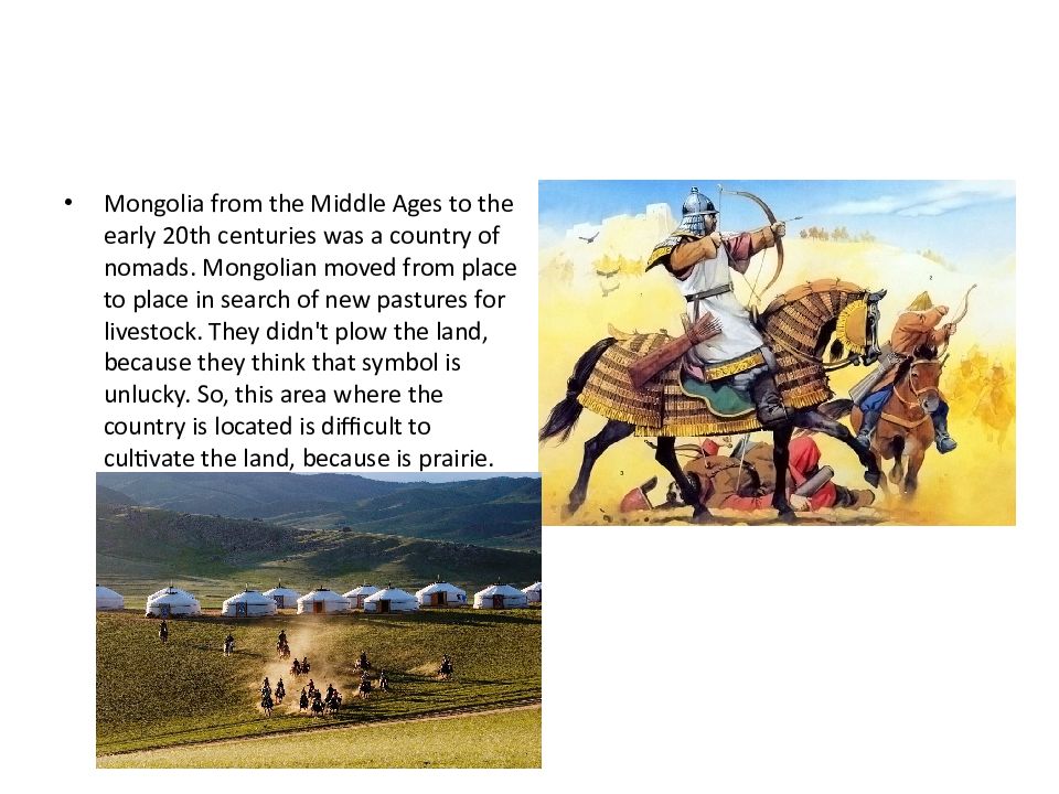 Mongolia from the Middle Ages to the early 20th centuries was a country of nomads. Mongolian moved from place to place in search of new pastures for livestock. They didn't plow the land, because they think that symbol is unlucky. So, this area where the country is located is difficult to cultivate the land, because is prairie.