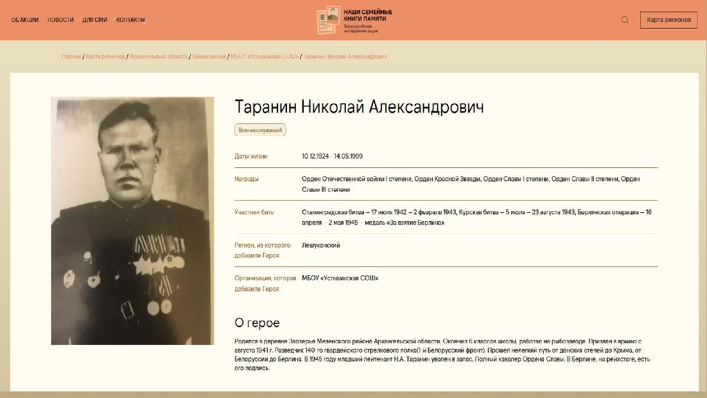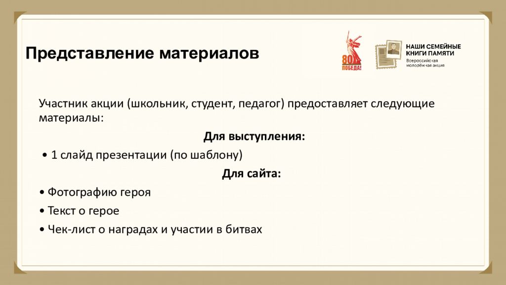 Участник акции (школьник, студент, педагог ) предоставляет следующие материалы: Для выступления : • 1 слайд презентации (по шаблону) Для сайта: • Фотографию героя • Текст о герое • Чек-лист о наградах и участии в битвах