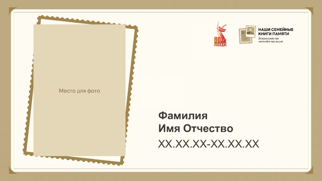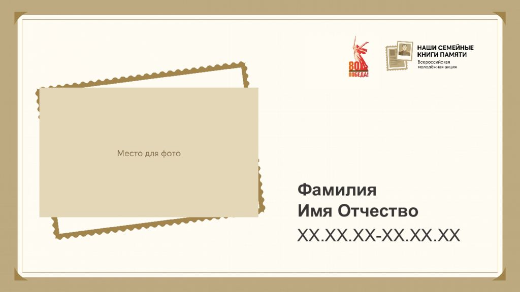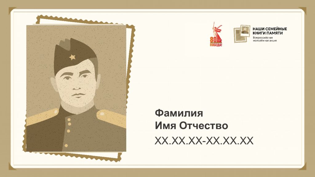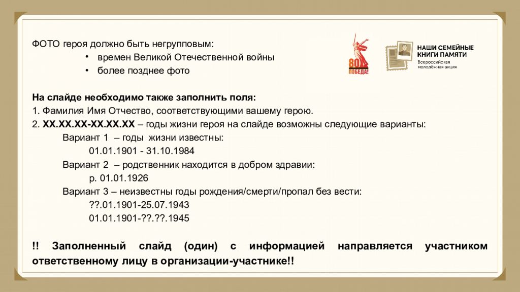 ФОТО героя должно быть негрупповым: времен Великой Отечественной войны более позднее фото На слайде необходимо также заполнить поля: 1. Фамилия Имя Отчество, соответствующими вашему герою. 2. ХХ.ХХ.ХХ-ХХ.ХХ.ХХ – годы жизни героя на слайде возможны следующие варианты: Вариант 1 – годы жизни известны: 01.01.1901 - 31.10.1984 Вариант 2 – родственник находится в добром здравии: р. 01.01.1926 Вариант 3 – неизвестны годы рождения/смерти/пропал без вести: ??.01.1901-25.07.1943 01.01.1901-??.??. 1945 !! Заполненный слайд (один) с информацией направляется участником ответственному лицу в организации-участнике!!