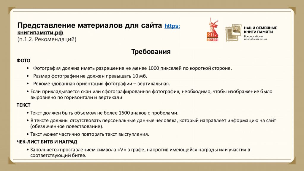 Слайд 7: Представление материалов для сайта https:// книгипамяти.рф (п.1.2. Рекомендаций)