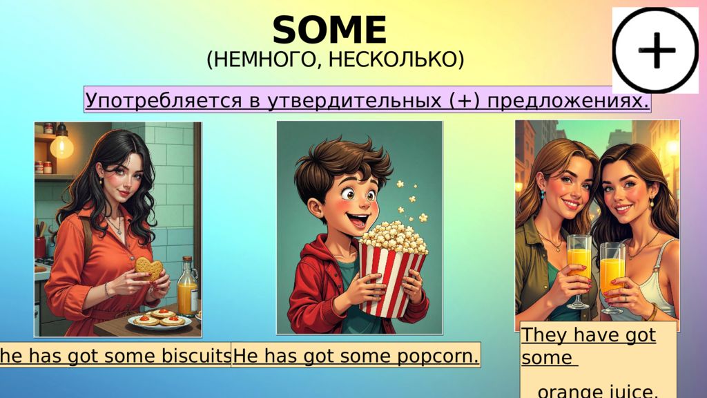 Употребляется в утвердительных (+) предложениях. She has got some biscuits. They have got some orange juice. He has got some popcorn.