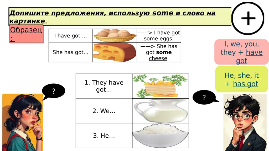 ? ? Допишите предложения, использую some и слово на картинке. 1. They have got… 2. We… 3. He… Образец: I have got … ——> I have got some eggs. She has got… ——> She has got some cheese. I, we, you, they + have got He, she, it + has got