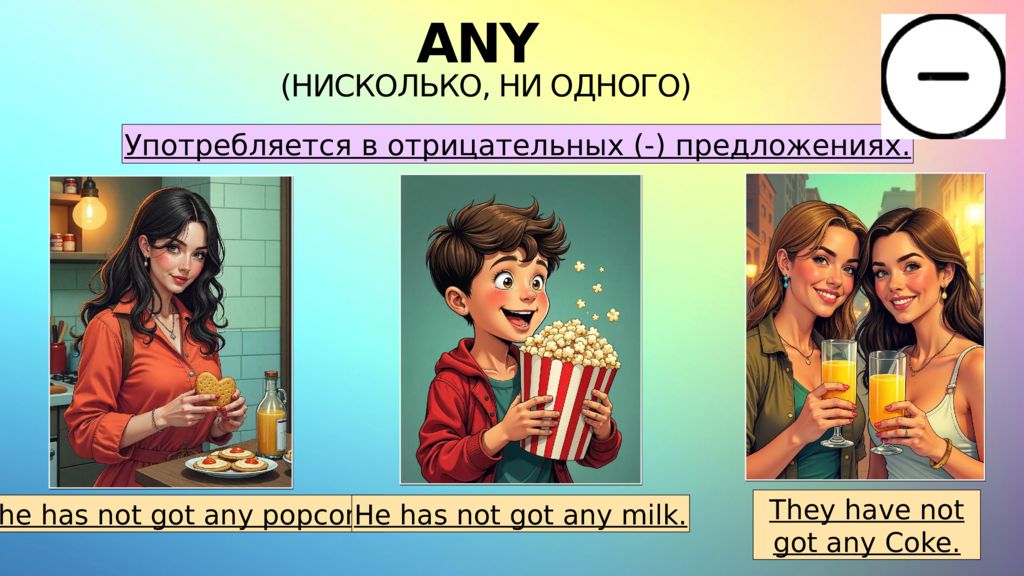 Употребляется в отрицательных (-) предложениях. She has not got any popcorn. They have not got any Coke. He has not got any milk.