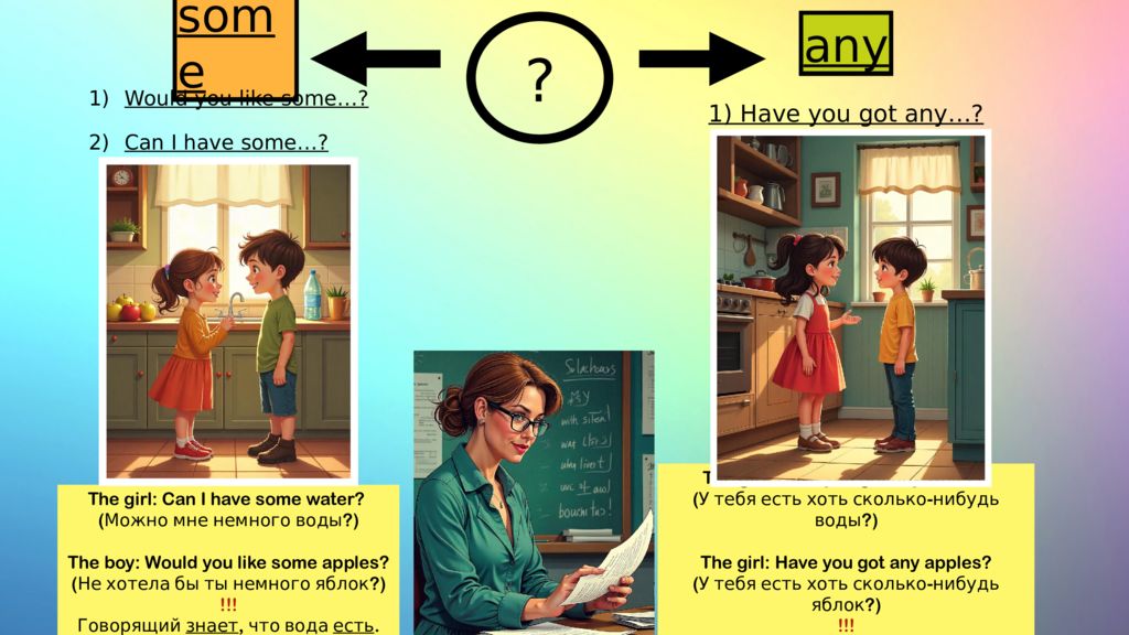 ? The girl: Can I have some water? (Можно мне немного воды?) The boy: Would you like some apples? (Не хотела бы ты немного яблок?) !!! Говорящий знает, что вода есть. The girl: Have you got any water? (У тебя есть хоть сколько-нибудь воды?) The girl: Have you got any apples? (У тебя есть хоть сколько-нибудь яблок?) !!! Девочка не знает, есть вода или нет. some any Would you like some…? Can I have some…? 1) Have you got any…?