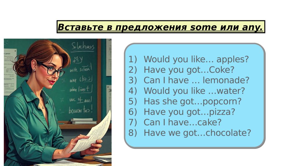 Вставьте в предложения some или any. Would you like… apples? Have you got…Coke? Can I have … lemonade? Would you like …water? Has she got…popcorn? Have you got…pizza? Can I have…cake? Have we got…chocolate?