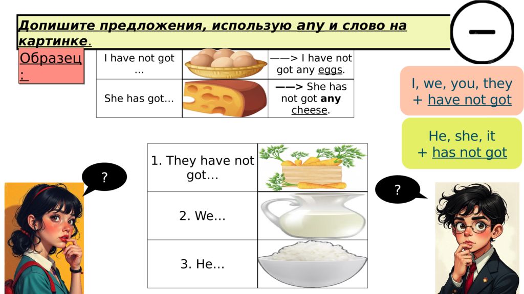 ? ? Допишите предложения, использую any и слово на картинке. 1. They have not got… 2. We… 3. He… Образец: I have not got … ——> I have not got any eggs. She has got… ——> She has not got any cheese. I, we, you, they + have not got He, she, it + has not got