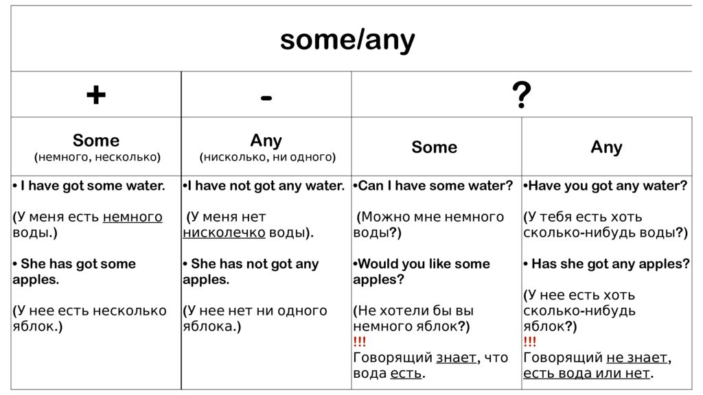 some/any + - ? Some (немного, несколько) Any (нисколько, ни одного) Some Any • I have got some water. (У меня есть немного воды.) • She has got some apples. (У нее есть несколько яблок.) •I have not got any water. (У меня нет нисколечко воды). • She has not got any apples. (У нее нет ни одного яблока.) •Can I have some water? (Можно мне немного воды?) •Would you like some apples? (Не хотели бы вы немного яблок?) !!! Говорящий знает, что вода есть. •Have you got any water? (У тебя есть хоть сколько-нибудь воды?) • Has she got any apples? (У нее есть хоть сколько-нибудь яблок?) !!! Говорящий не знает, есть вода или нет.