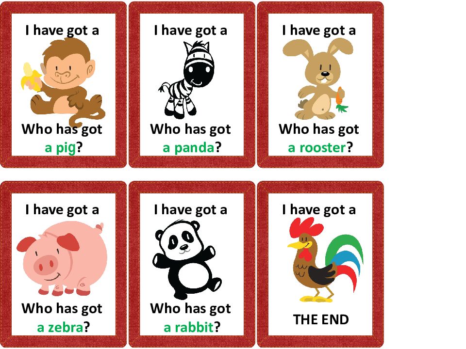 I have got a Who has got a pi g ? I have got a Who has got a zebra ? I have got a Who has got a panda ? I have got a Who has got a rabbit ? I have got a Who has got a rooster ? I have got a THE END
