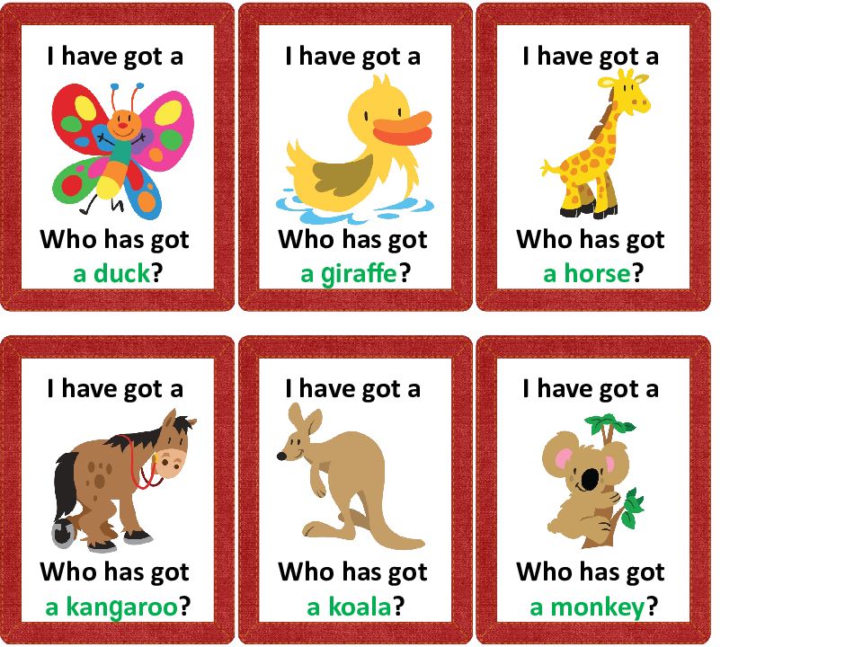 I have got a Who has got a duck ? I have got a Who has got a kan g aroo ? I have got a Who has got a g iraffe ? I have got a Who has got a koala ? I have got a Who has got a horse ? I have got a Who has got a monkey ?