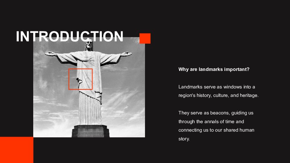 INTRODUCTION Why are landmarks important? Landmarks serve as windows into a region's history, culture, and heritage. They serve as beacons, guiding us through the annals of time and connecting us to our shared human story.