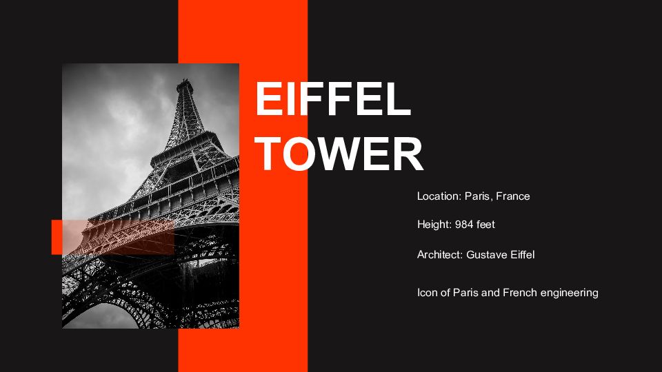 Location: Paris, France Height: 984 feet Architect: Gustave Eiffel Icon of Paris and French engineering